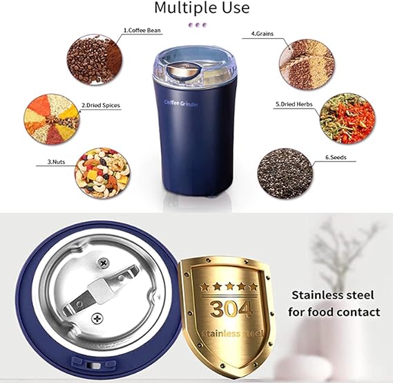 ✍️This grinder is is made of high-quality stainless steel, which is durable and has a long service life. the bottom of the grinder is equipped with a rubber gasket to prevent the motor from being damaged. it is suitable for grinding various kinds of grains, such as rice, corn, soybeans, nuts, beans, etc.Coffee beans into freshly ground coffee in less than 10 seconds; perfectly grinds nuts, seeds, herbs and spices.Just press on touch button with one finger, the grinder will start grinding, and only stop untill you release your finger from the button. You can keep pressing the button for different time length to control the coarse, medium and fine grinding state. Large capacity good for each use under 2.8oz/80g herbs..Small body can better save space, and it is very convenient for storage, it can be placed in any corner of the home,easy to carry.Powerful Grinder for Coffee Beans, Herb,Spices, Peanuts, Grains and More. Not only a electric grinder, but also a electric spice grinder, spice blender, espresso grinder, coffee mill, food grinders, herb grinder, espresso grinder, cold brew maker, spice chopper, pepper chopper, nut grinder. Grinder fits for multiple uses.