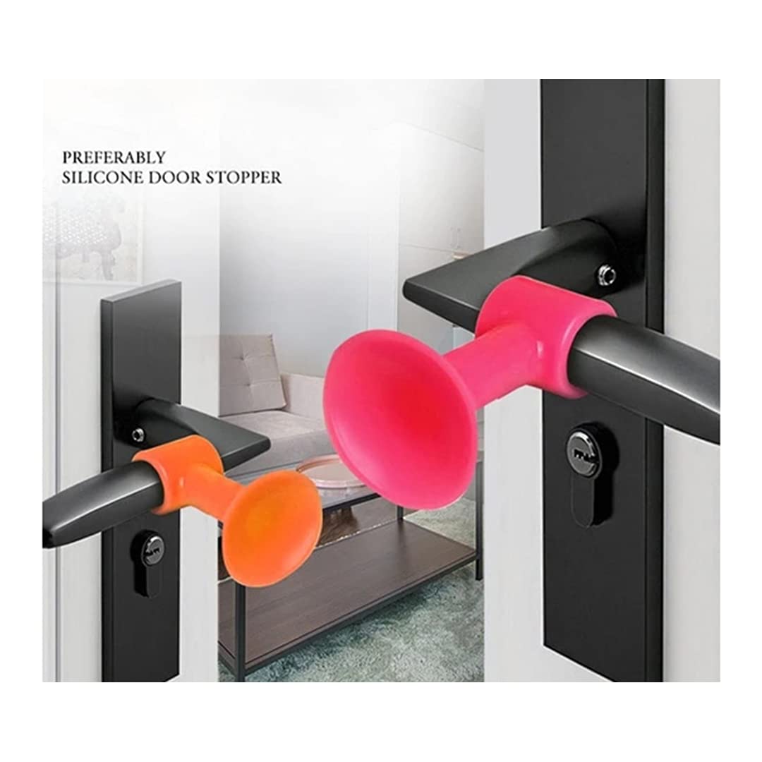 ✼No Need to Drill, No Damage on Your Wall and Doors. Easy to Install Door Catch within 30 seconds, No Tools Needed. Safe for your body and house. Durable material can recycle. This Door Stopper is removable, trackless, washable and reusable. Material Silicon. Random from green, pink, blue and yellow. Applicable wall : glass, wallpaper, tiles, metal, lime wall, etc. bathroom doors, kitchen doors, study doors, bedroom doors and so on. Put the collar of the door stop in the middle of the lever door handle, with the suction cup of the door stop facing the wall.
